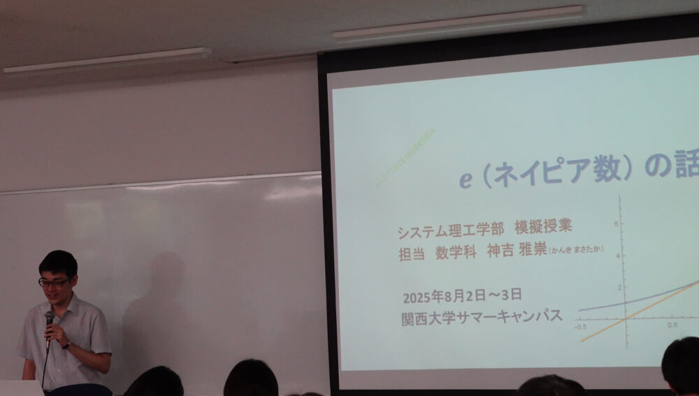 2025.08.06 - 活動報告 2025年度サマーキャンパスで模擬授業を行いました 2025年8月2日・3日の2日間、関西大学のサマーキャンパスにて、神吉先生が模擬授業を行いました。今回のテーマは「e(ネイピア数)の話」でした。ネイピア数はe=2.7182…….と無限に続く小数で表される数で、大学の数学に欠かせません。模擬授業では、難しい数式を使わずに、グラフを描くことで直感的にeを体験しました。 View All